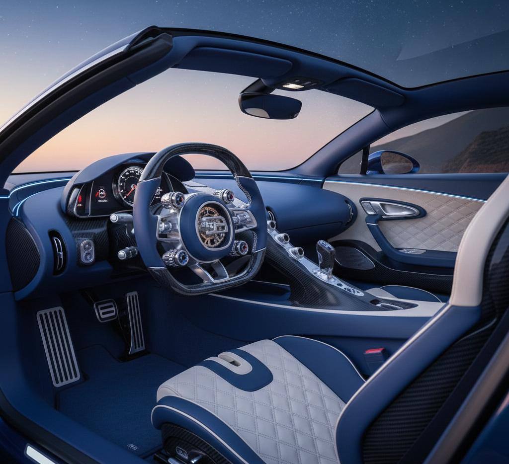 L’intérieur privilégie une expérience de conduite analogique, avec un minimum d’écrans et un accent mis sur la mécanique, des matériaux tactiles et des finitions luxueuses (cuir, métaux, cristaux). Certains éléments évoquent l’horlogerie mécanique.